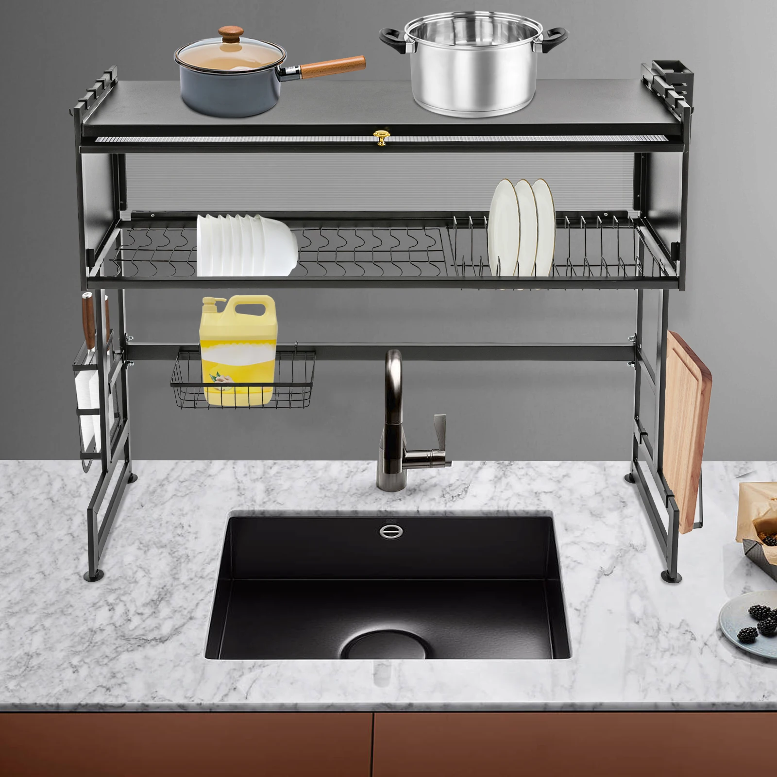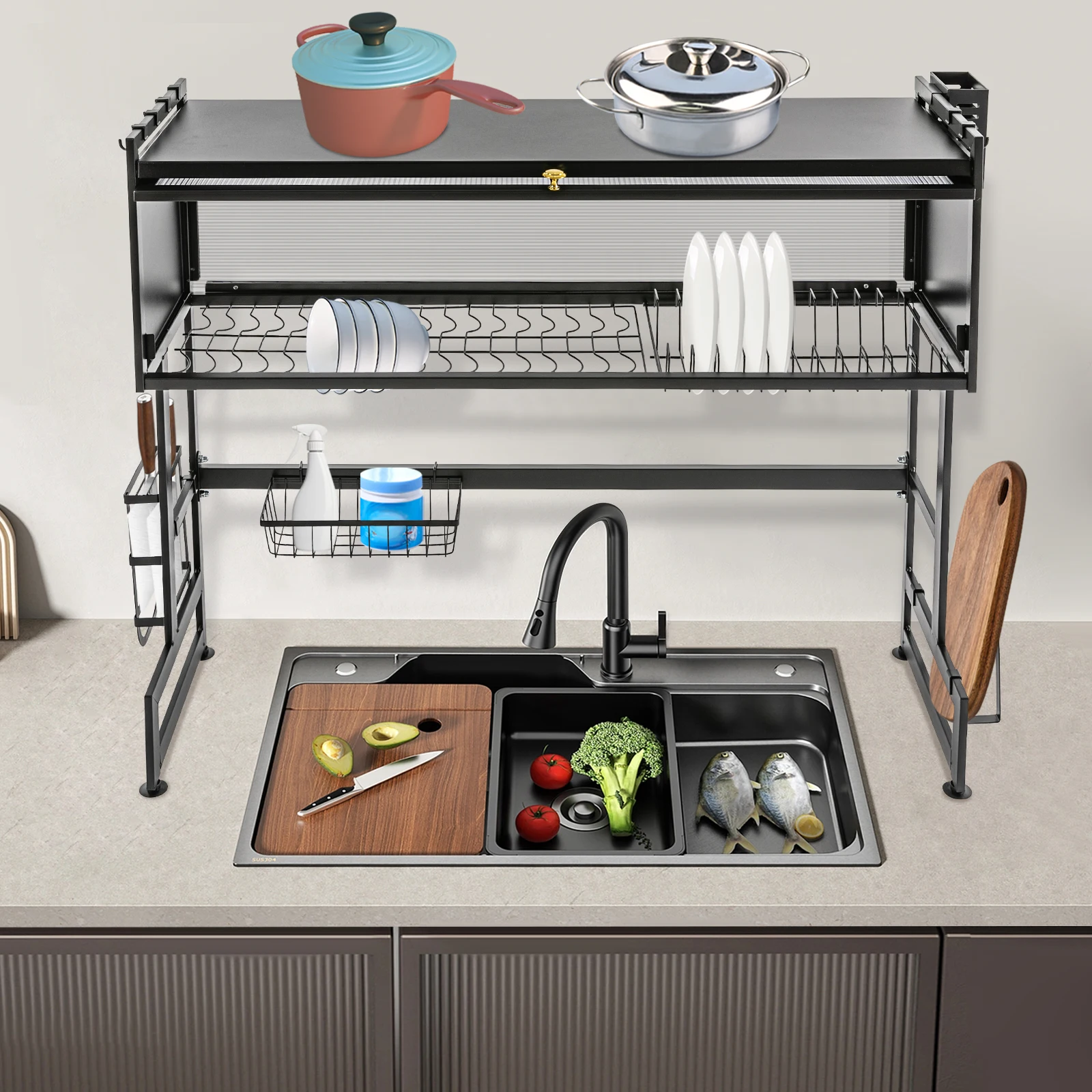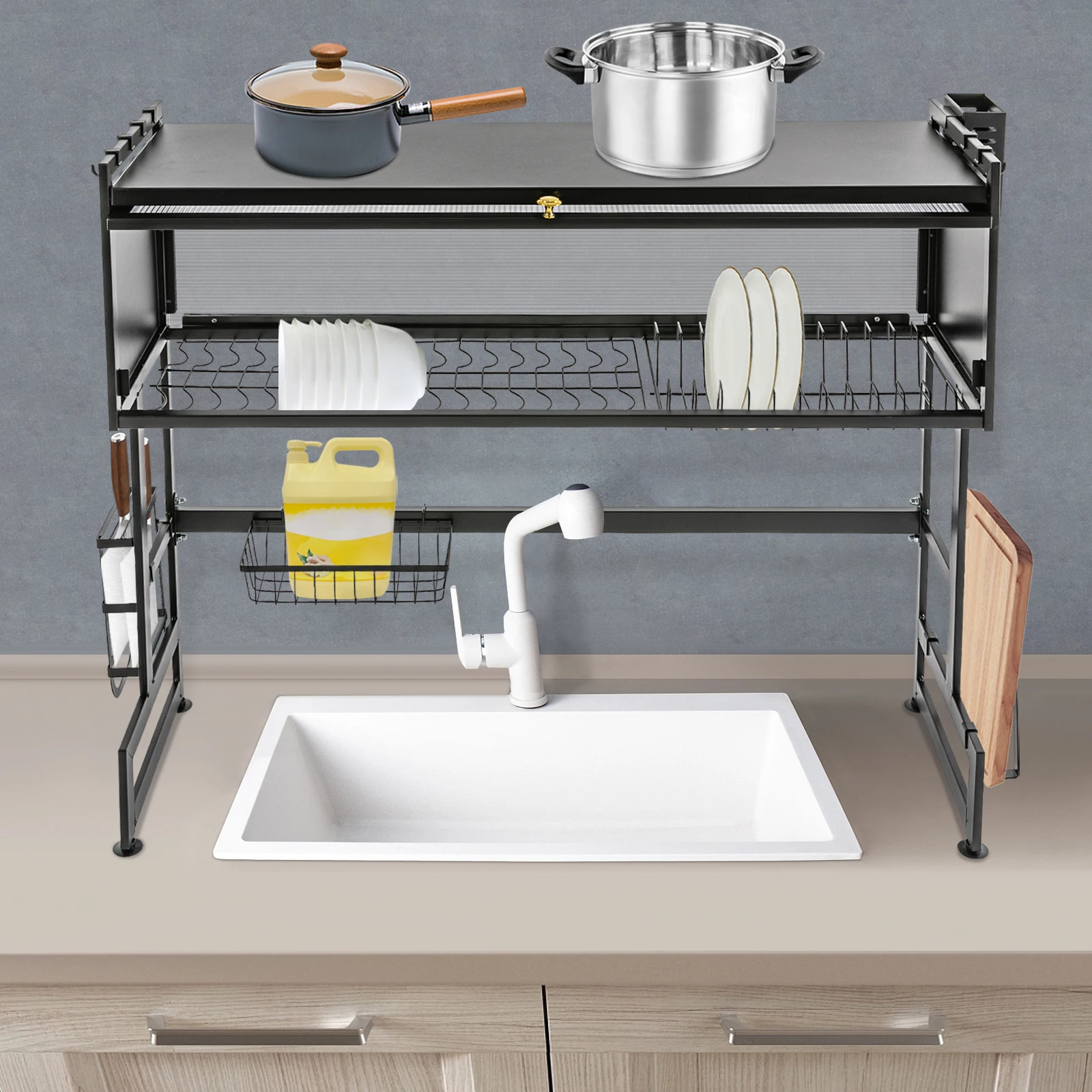 Space-saving: This product is typically placed above the sink. The double-tier structure makes full use of vertical space, allowing you to easily arrange your kitchen utensils neatly without taking up too much countertop space, and it can also be easily placed in the corner of the countertop.