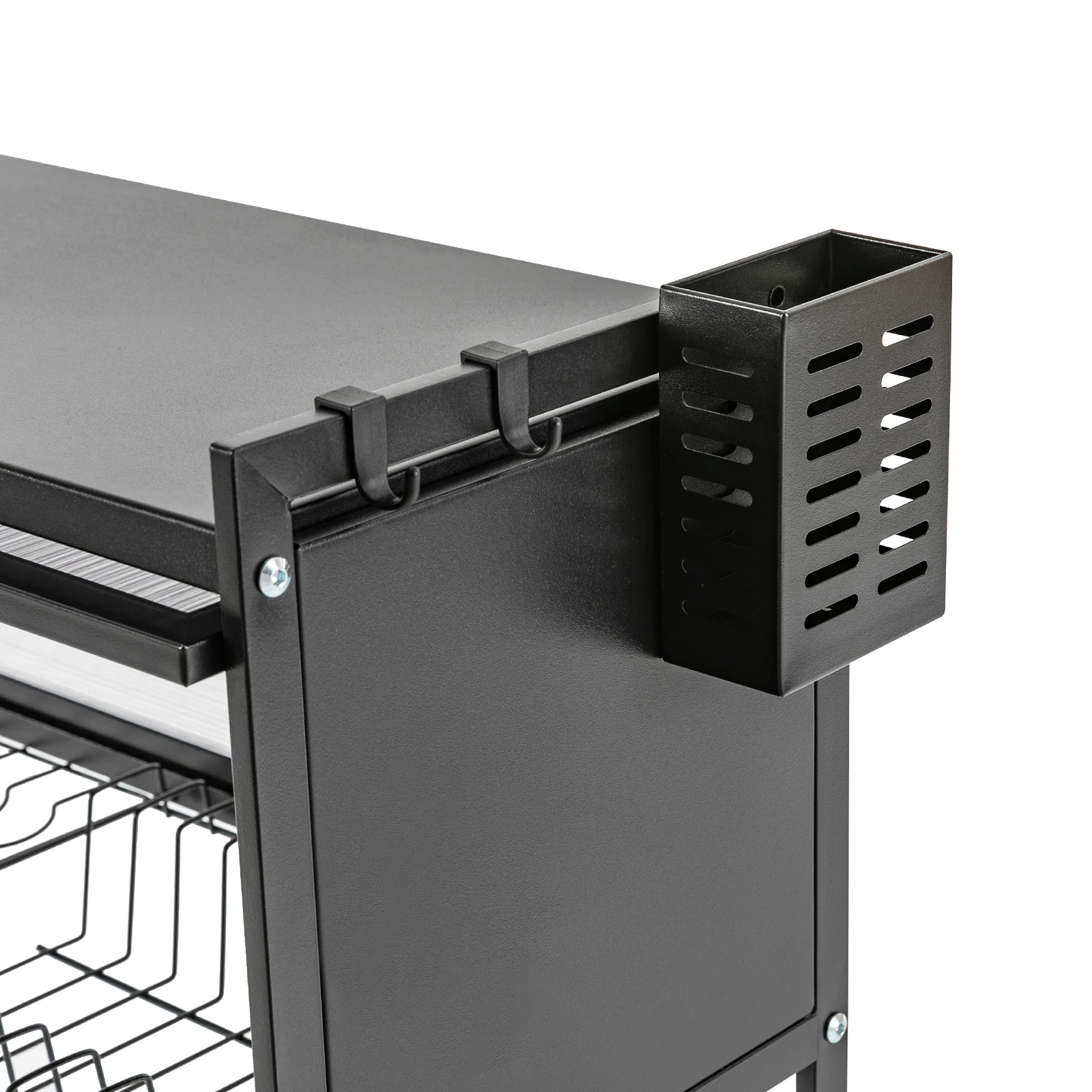 Large Capacity: The double shelf provides plenty of space for products and can hold a wide range of crockery and cutlery. The upper tier can hold pots, pans, spices, etc., while the lower tier can hold bowls, plates, and cups. A chopstick holder, knife holder, chopping board holder, and wash basket allow you to place other kitchen utensils for a tidy and organized kitchen. Moreover, six hooks on the side make it easy to hang spoons and other cutlery.